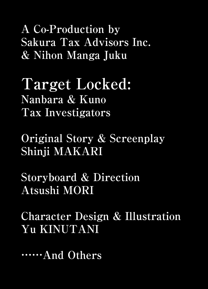監修:税理士法人さくら税務シナリオ:真刈信二ネーム:モリ淳史キャラ:衣谷遊背景ディレクション:松元保郎タイトルロゴ:奥村将仁プロデュース:藤沢学